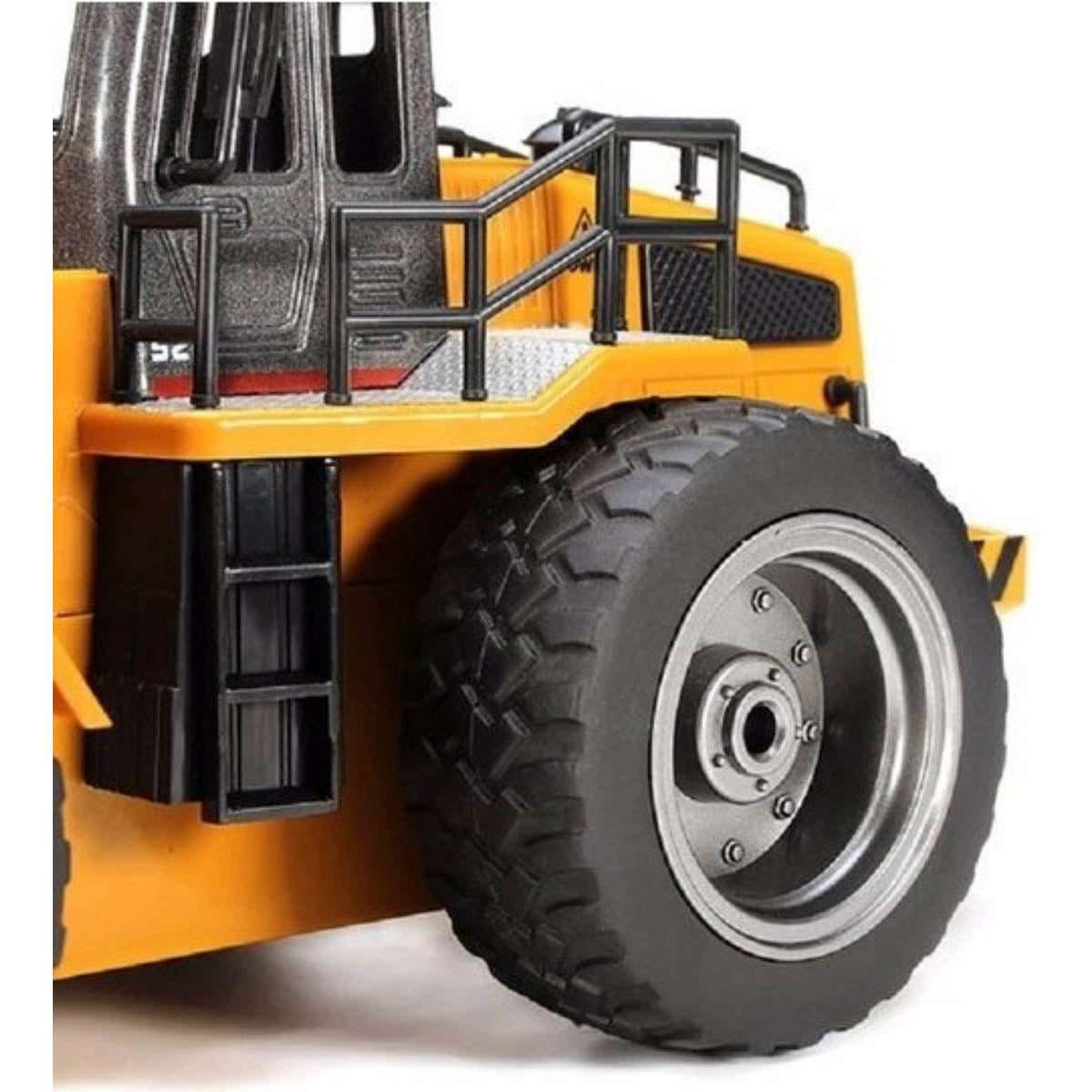 Der Bulldozer hat einen Allradantrieb (4x4) und ist mit einer LED-Beleuchtung mit LEDs ausgestattet. Eine 2,4-GHz-Fernsteuerung hebt das Spielzeug von der Masse ab.