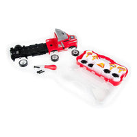 Set-Inhalt: ein LKW mit Koffer enthält Werkzeuge zum Drehen, ein zusätzliches Rad und Verkehrszeichen. Das Ganze ist aus Kunststoff.