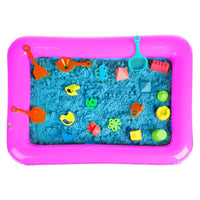 LARGE SET- the set for children contains: 1 kg of sand, 14 plastic moulds, rakes, sieve, spatula and funnel. This package will not get boring quickly, because so many creations are possible. This set of sand also includes an inflatable sandbox that helps you keep the sand together.