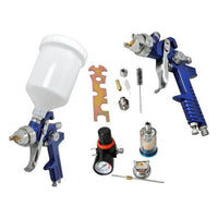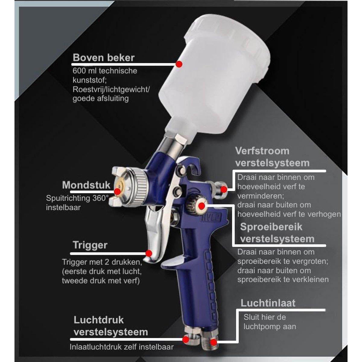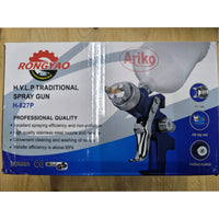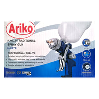Ariko HVLP gun Nozzles: 1.4 / 1.7 mm Container for 600 ml varnish Reducer with a pressure gauge Dewatering filter Key to assemble everything