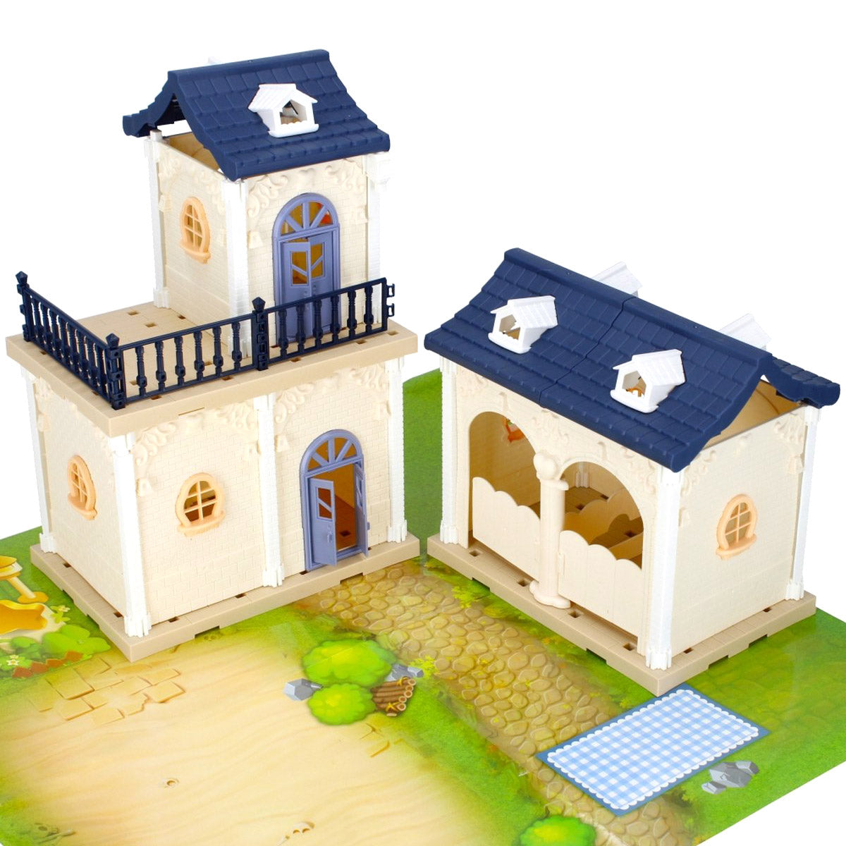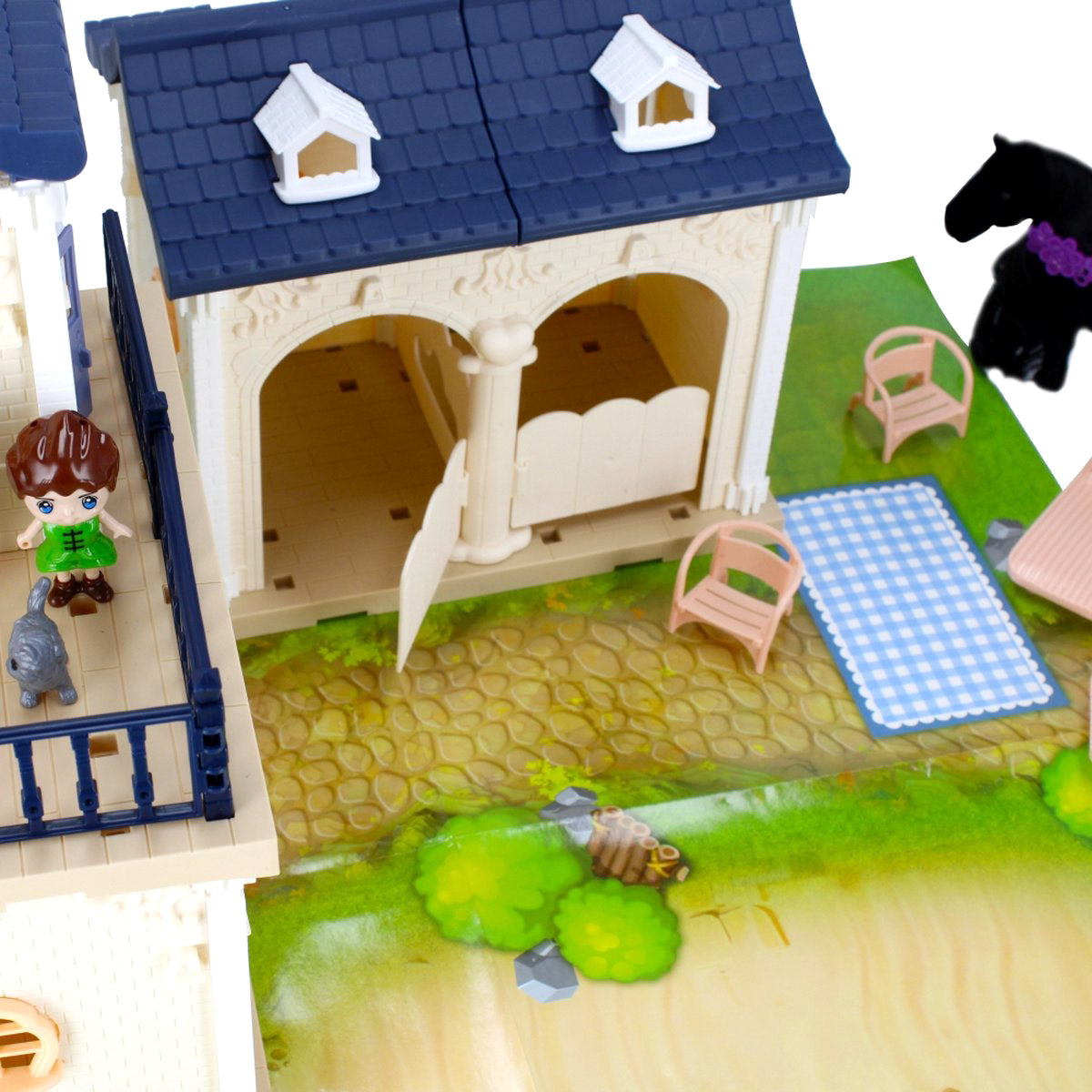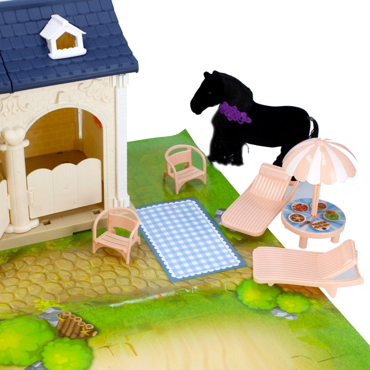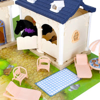La Villa comprend une écurie pour grands et petits chevaux, mais contient également d'autres gentils animaux de compagnie tels que des chats et un chien, une terrasse avec barbecue et bien sûr divers personnages.