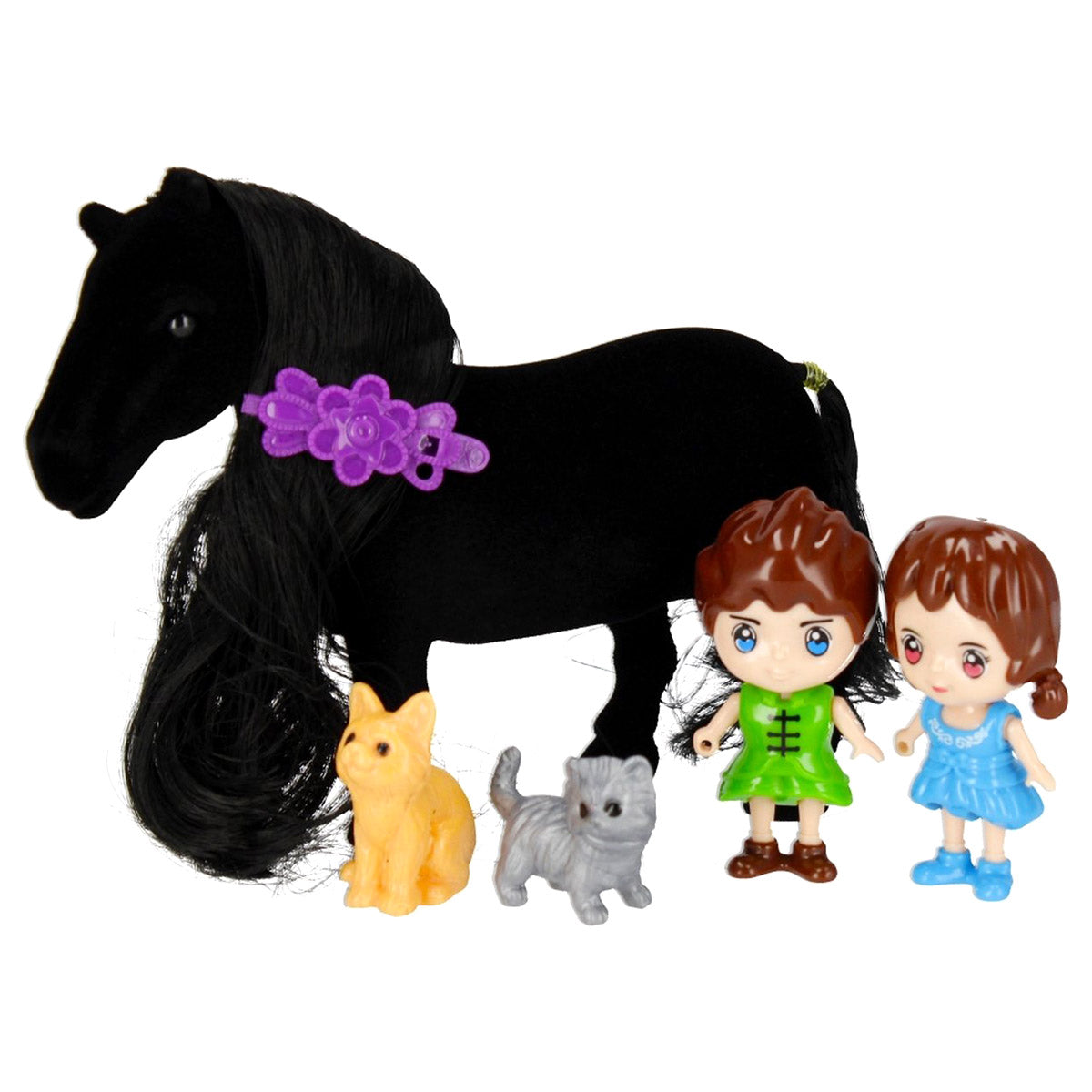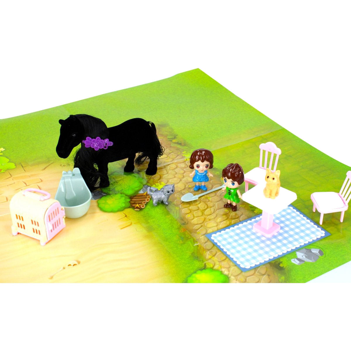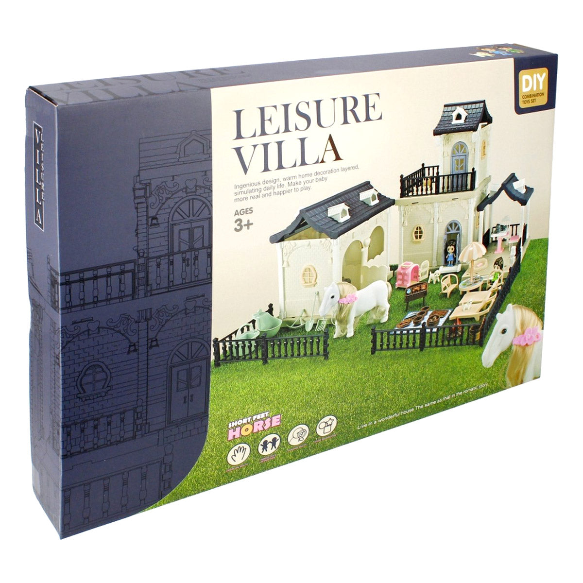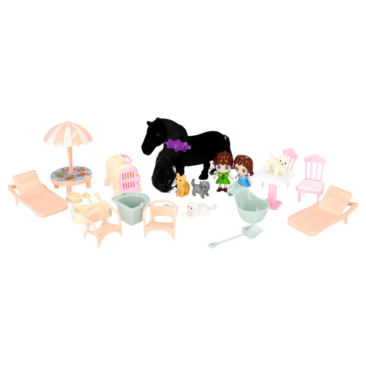 La Villa comprend une écurie pour grands et petits chevaux, mais contient également d'autres gentils animaux de compagnie tels que des chats et un chien, une terrasse avec barbecue et bien sûr divers personnages.