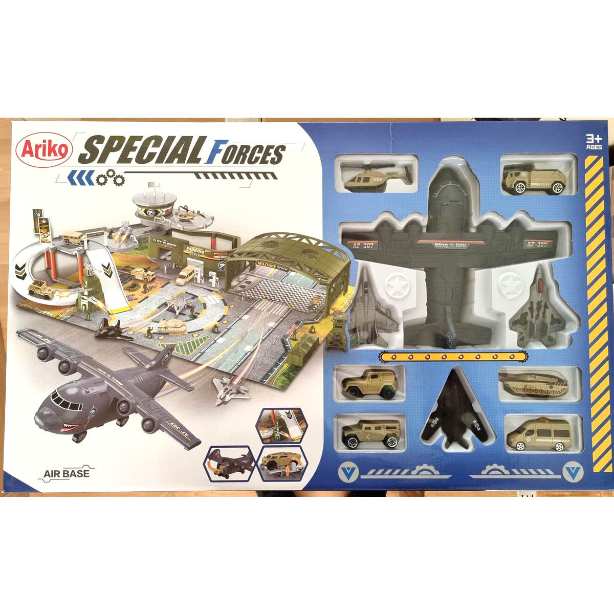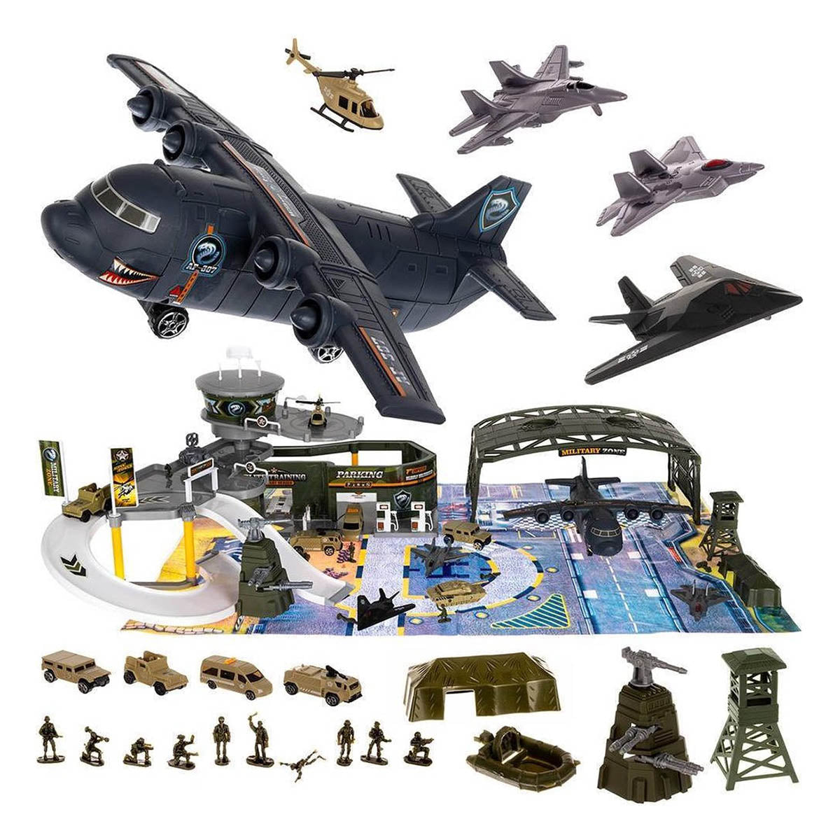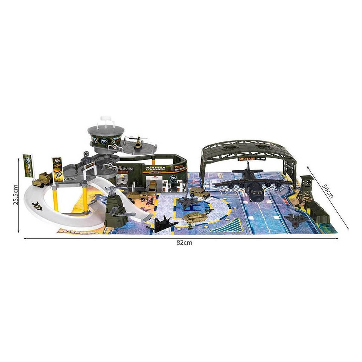 Ariko Luxe Special forces vliegveld | Militaire vliegbasis | Luchthaven Speelgoed set | met speelgoedkleed | Parking | Garage | Tankstation | 3 vliegtuigen | 1 helikopter | 1 legertank | 3 voertuigen