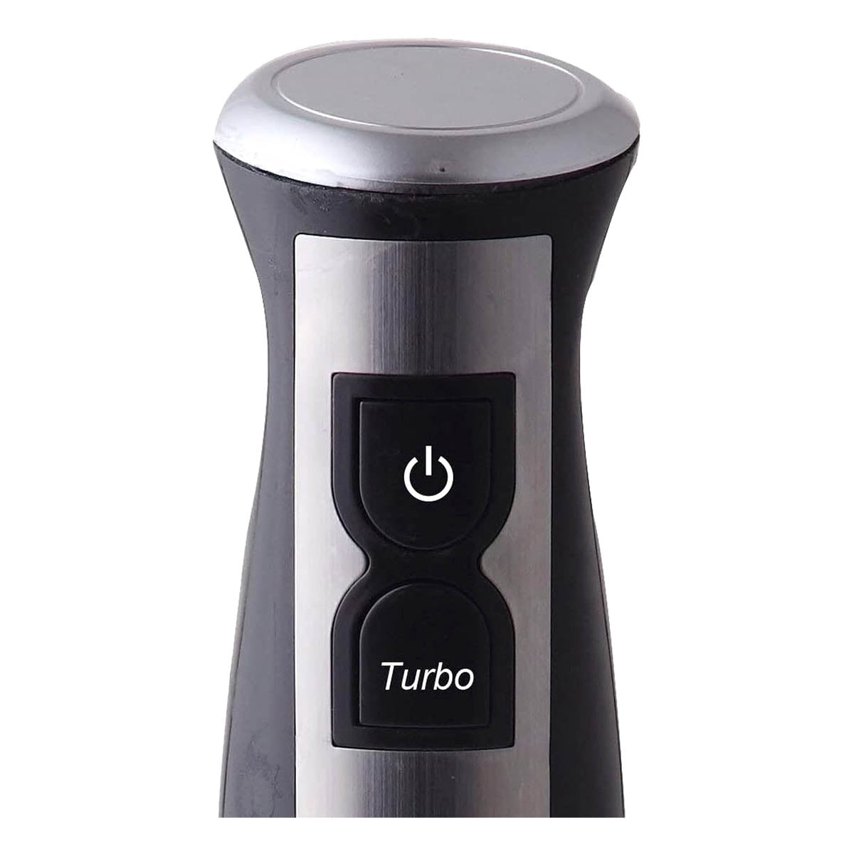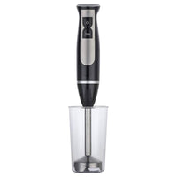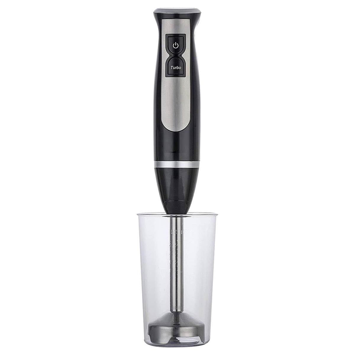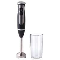 Inhoud van de doos: elegante roestvrijstalen staafmixer met 600 watt en roestvrijstalen messen, meng- en maatcontainer 600 ml